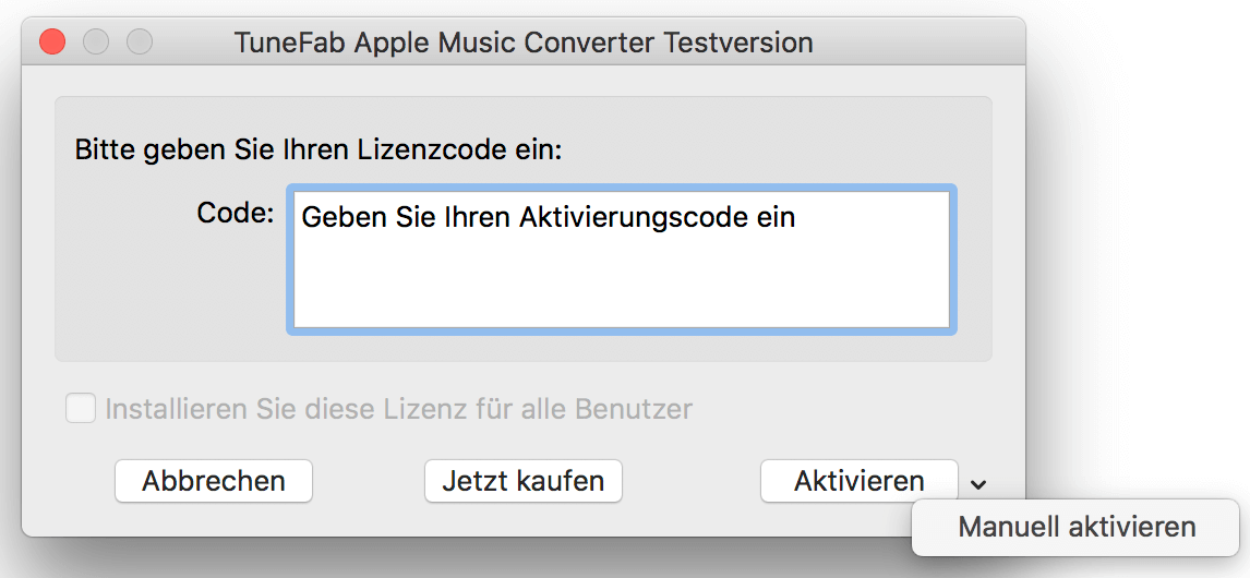 Stellen Sie zunächst sicher, dass Sie die richtige Version von TuneFab Apple Music Converter erworben haben. Zum Beispiel, eine Mac-Lizenz funktioniert exkl. auf der Mac Version des Programms. Im Fall keine Sorge, wir können Ihre Lizenz kostenlos umtauschen, kontaktieren Sie uns mal per support_de@tunefab.com.