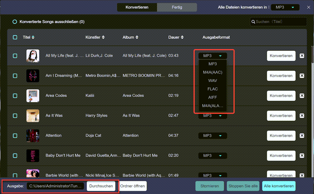 Schritt 3. Wählen Sie das Ausgabeformat unter „Alle Dateien konvertieren:“ oder „Ausgabeformat“ für die Songs, die Sie konvertieren wollen, aus.