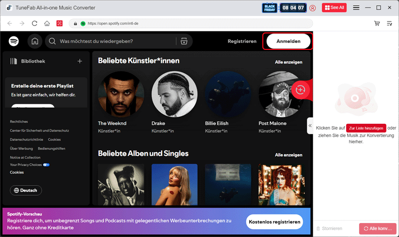Schritt 3. Melden Sie sich bei Ihrem Spotify-Konto in TuneFab an. Durch die Anmeldung können Sie die Erfolgsquote bei der Konvertierung Ihrer Spotify-Musik erhöhen.